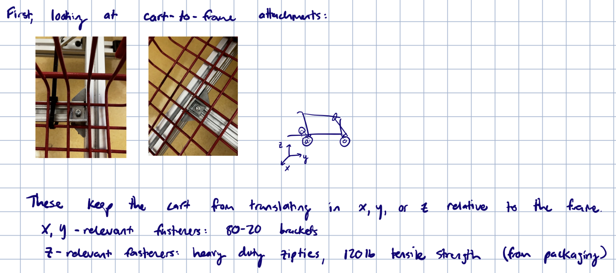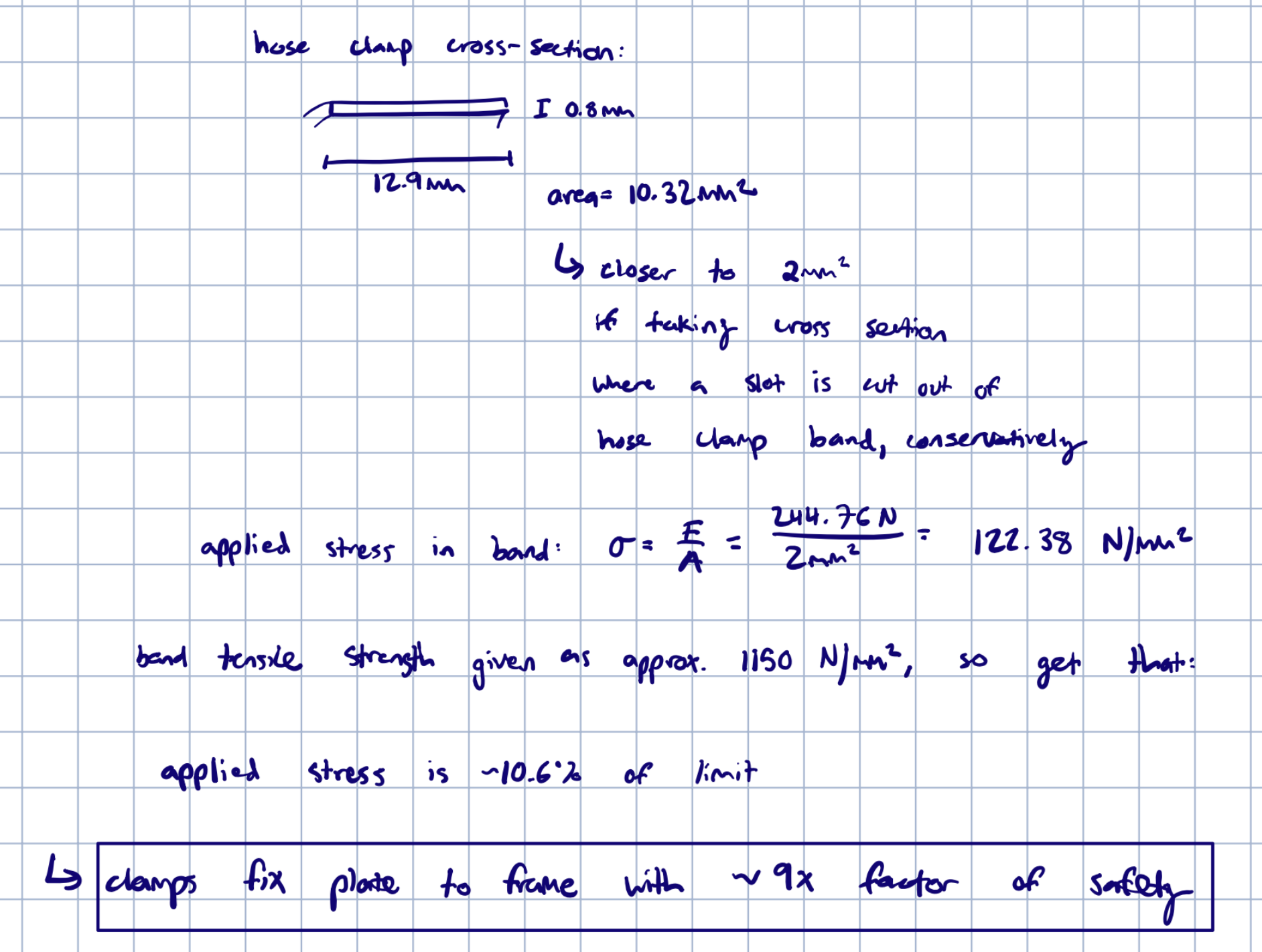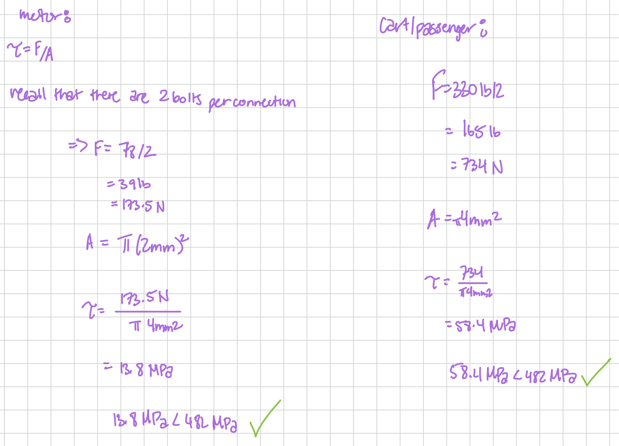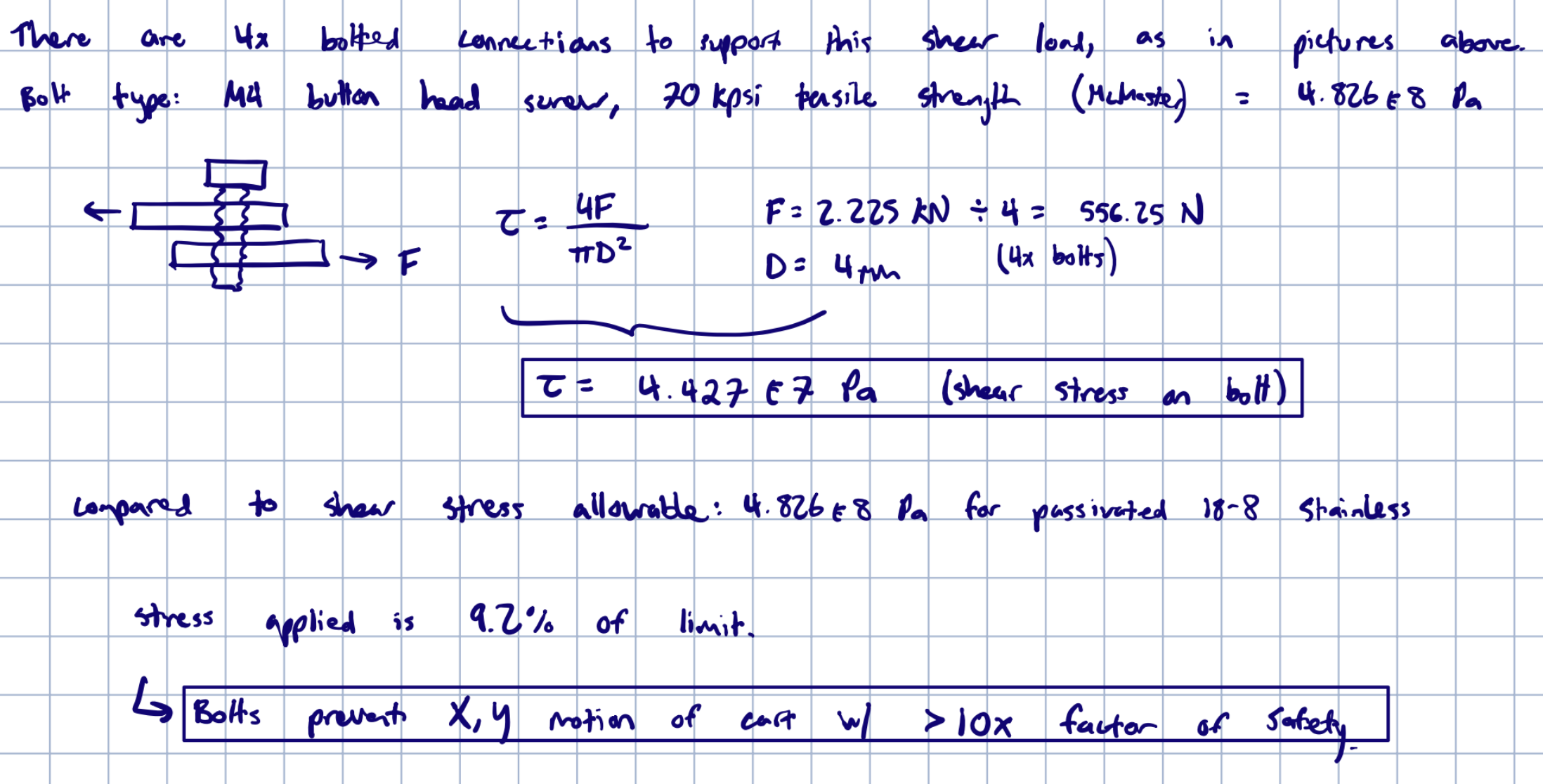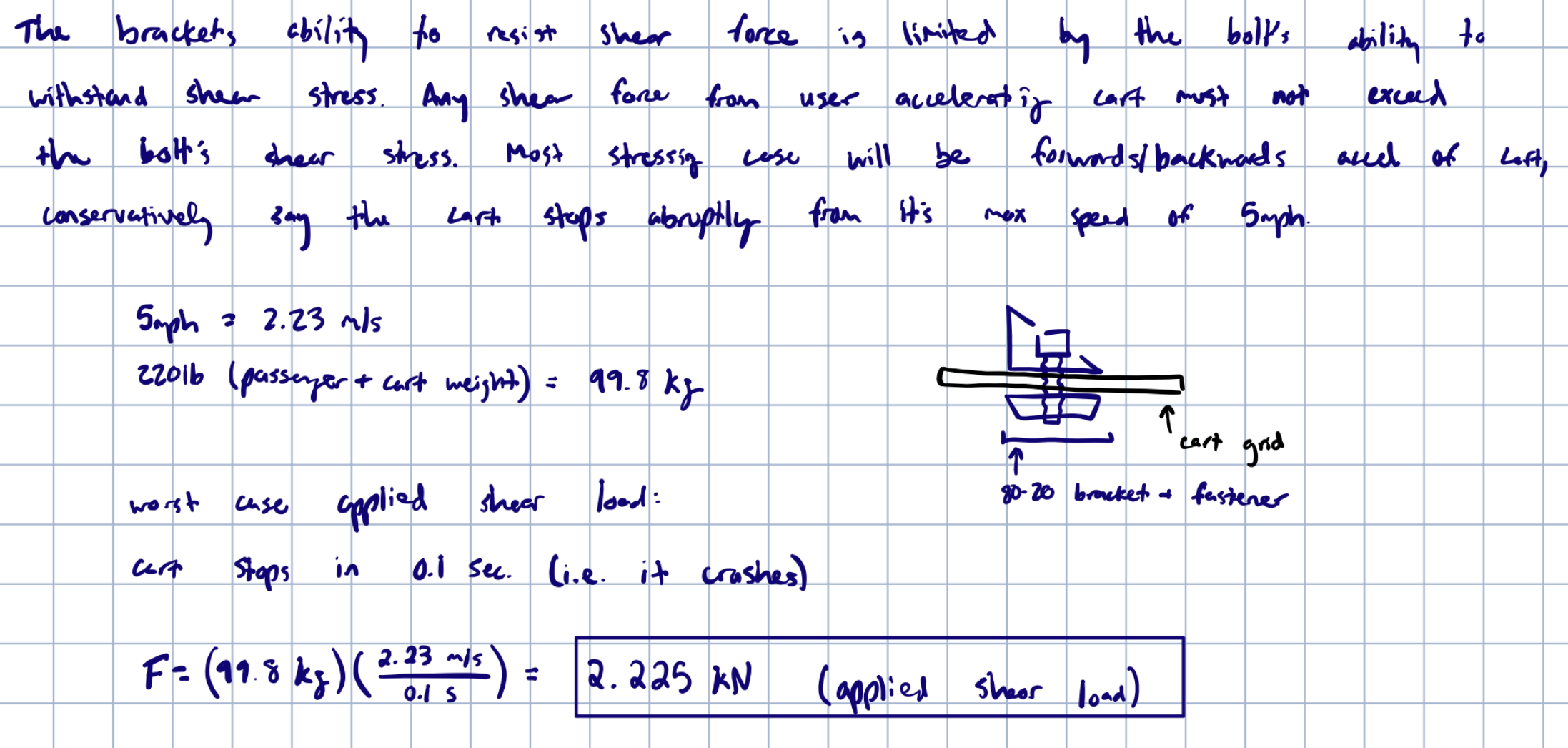There are 4 corner brackets. Each bracket contains 2 screws and 2 T-nuts. This image shows the calculations that ensure the shear stress of each screw on the corner brackets does not exceed the tensile strength of the screws.