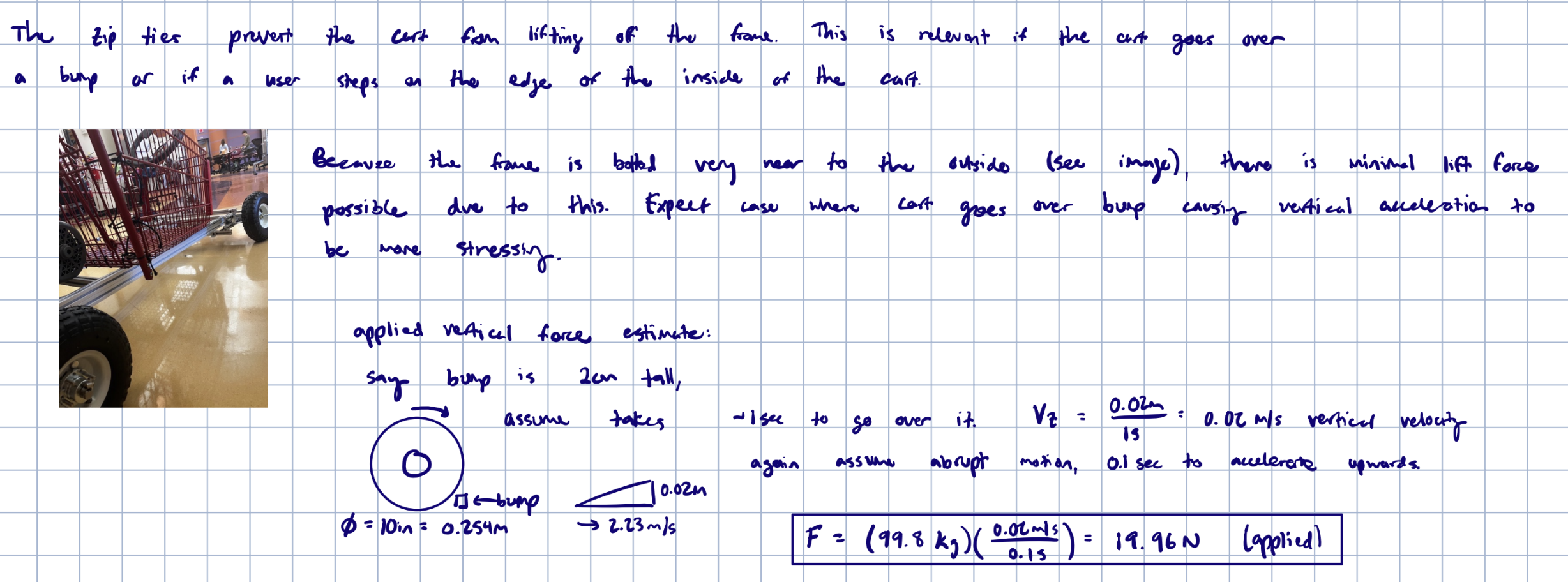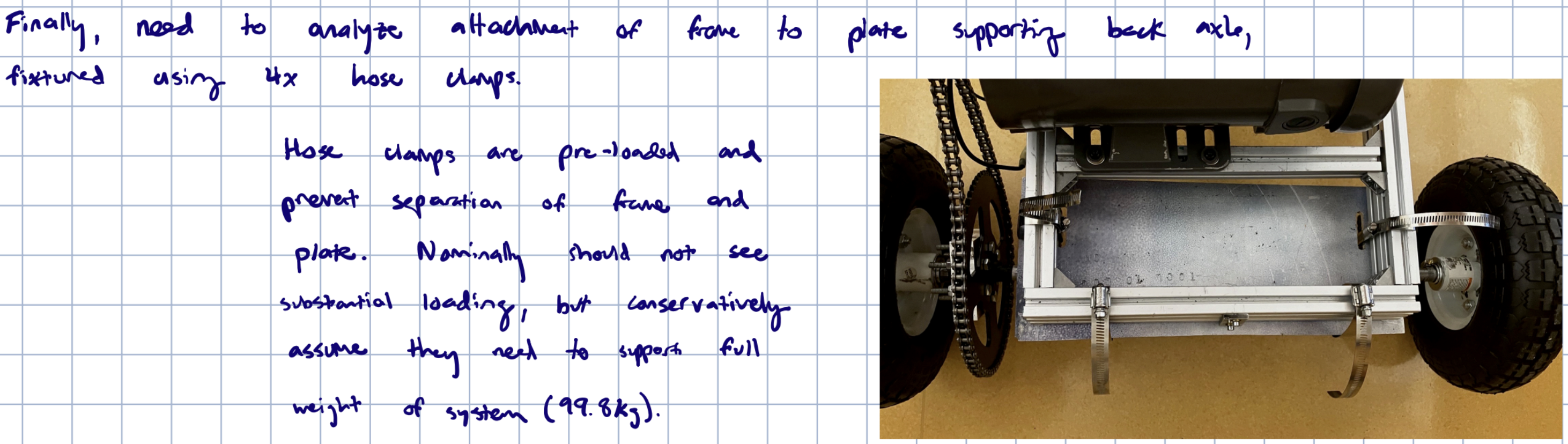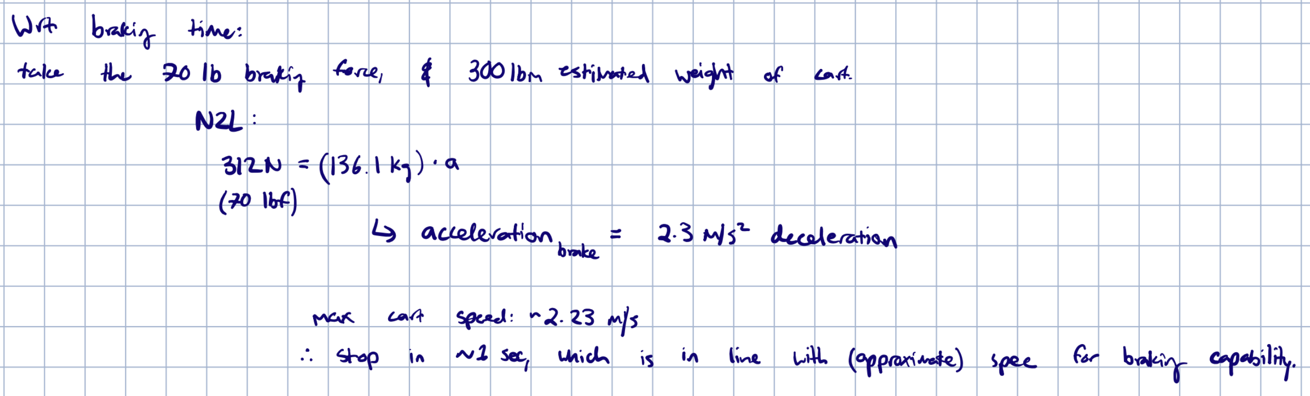 The calculations below show how we solved for the desired torque and speed of the system, assuming that our entire system weighs 300 pounds and we want a speed of at least 5mph and acceleration of \(1 m/s^2\). We assumed that the weight is evenly distributed among the four wheels.