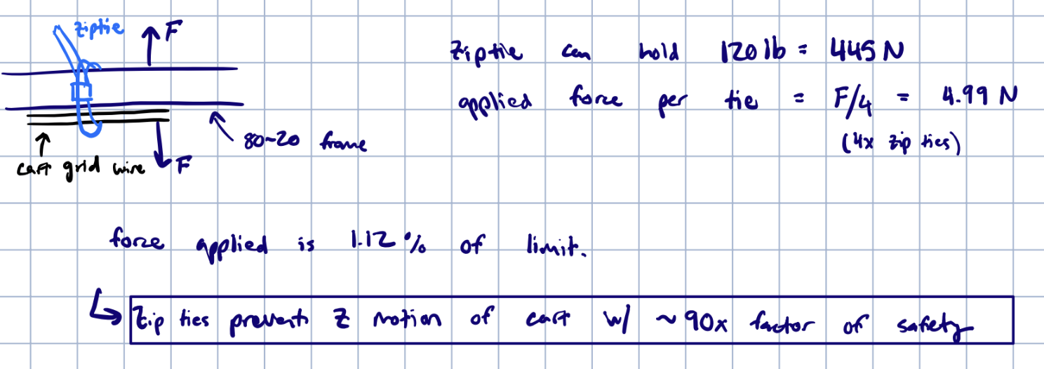 Analysis on each screw on the cross bar connections that ensures their shear stress does not exceed their tensile strength.
