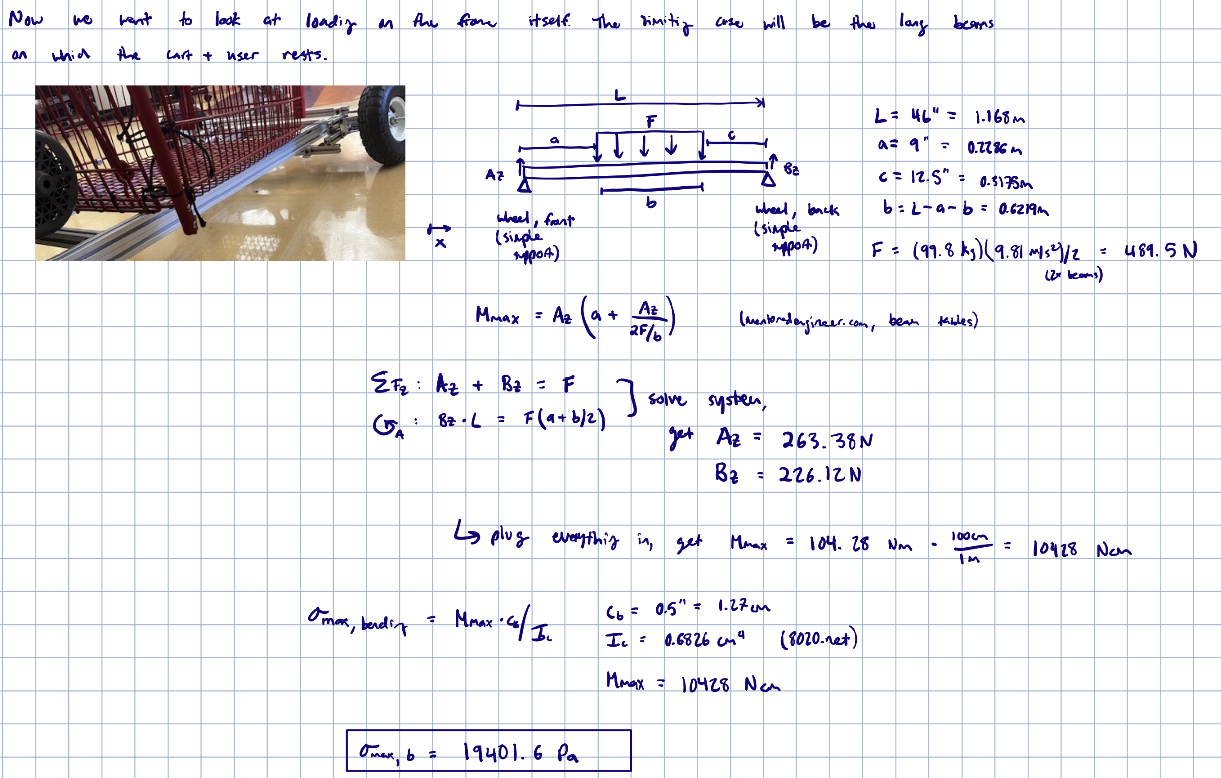 In order to find the lifetime of the back axle bearings, we can model the bearings as a simply supported theme with 2 point loads acting on the bearings from the weight of the vehicle similar to how we modeled the system to solve for bending stress.
