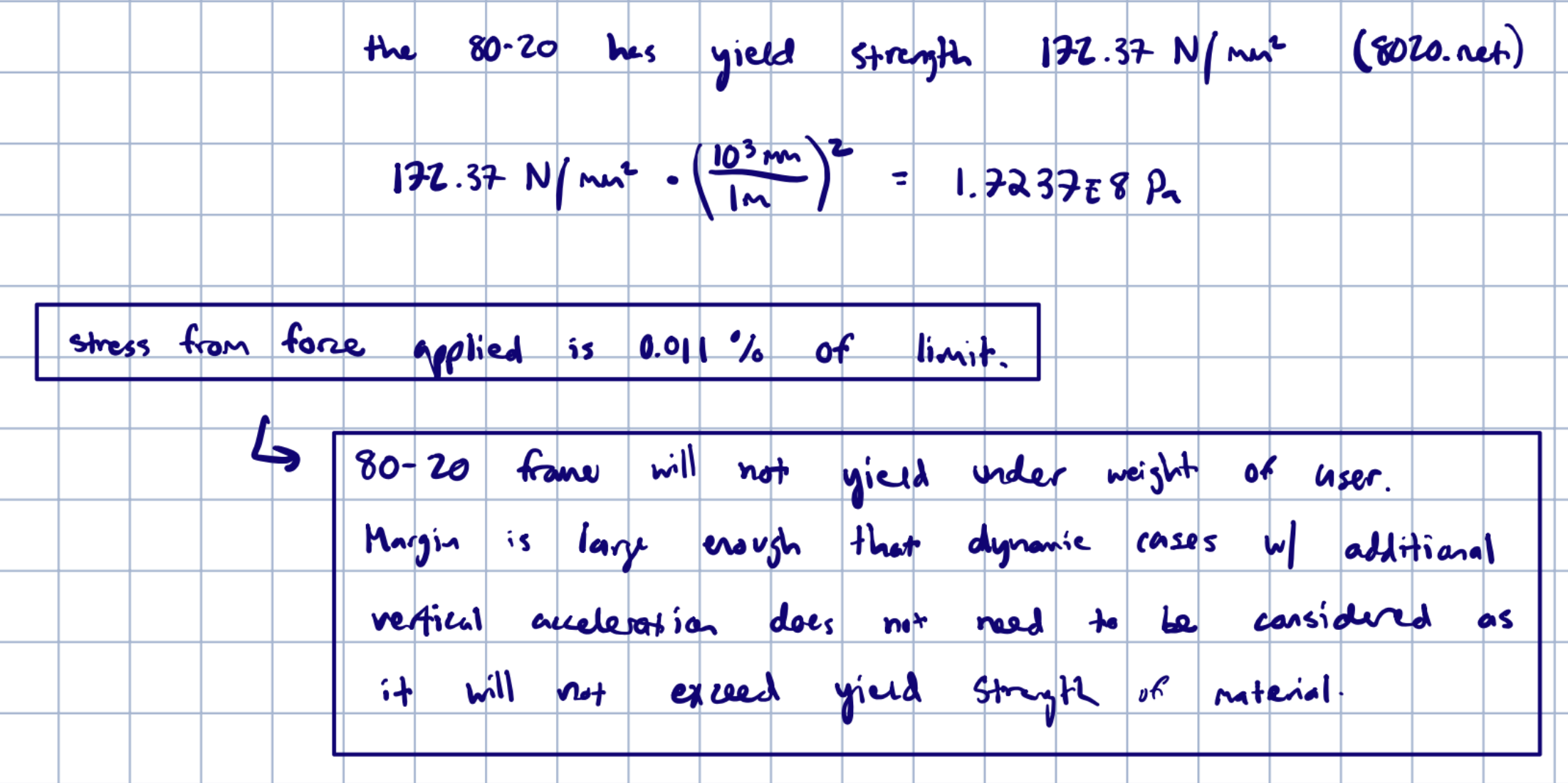 The bending stress of 172.37 MPa was less than the yield stress of structural steel, and thus will not yield under the expected load.
