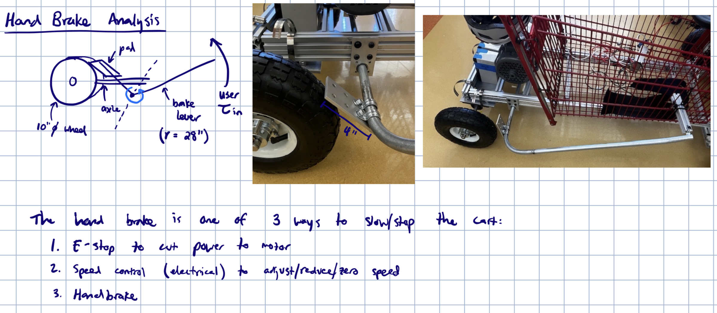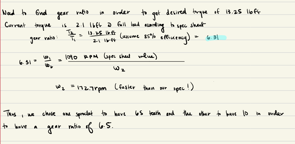By using the motor RPM and torque chart, we were able to determine that we would need a 6.31 gear ratio in order to reach the desired torque. Thus, we implemented two sprockets for our back axle, where the driving axle has a 10 tooth sprocket transmitting power to a 65 tooth sprocket connected to the wheels, giving us a 6.4 ratio.