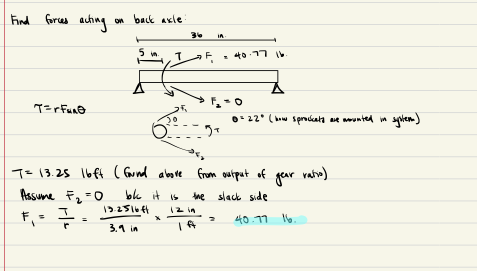 We can first draw a FBD of the torsional stresses acting on the shaft due to the tension of the chain acting on the sprocket. From our calculations above, we know that the torque is expected to be 13.25 lb-ft due to the gear ratio implemented. Thus, we need to find the 2 forces acting on the sprocket due to the chain.