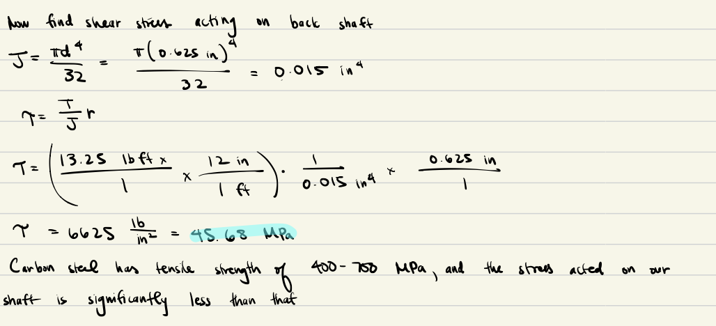 Carbon steel has a tensile strength between 400-700 MPa, and the stress expected to act on our shaft is significantly less than that. Thus, our back shaft should be able to withstand the shear and torsional stress it undergoes.