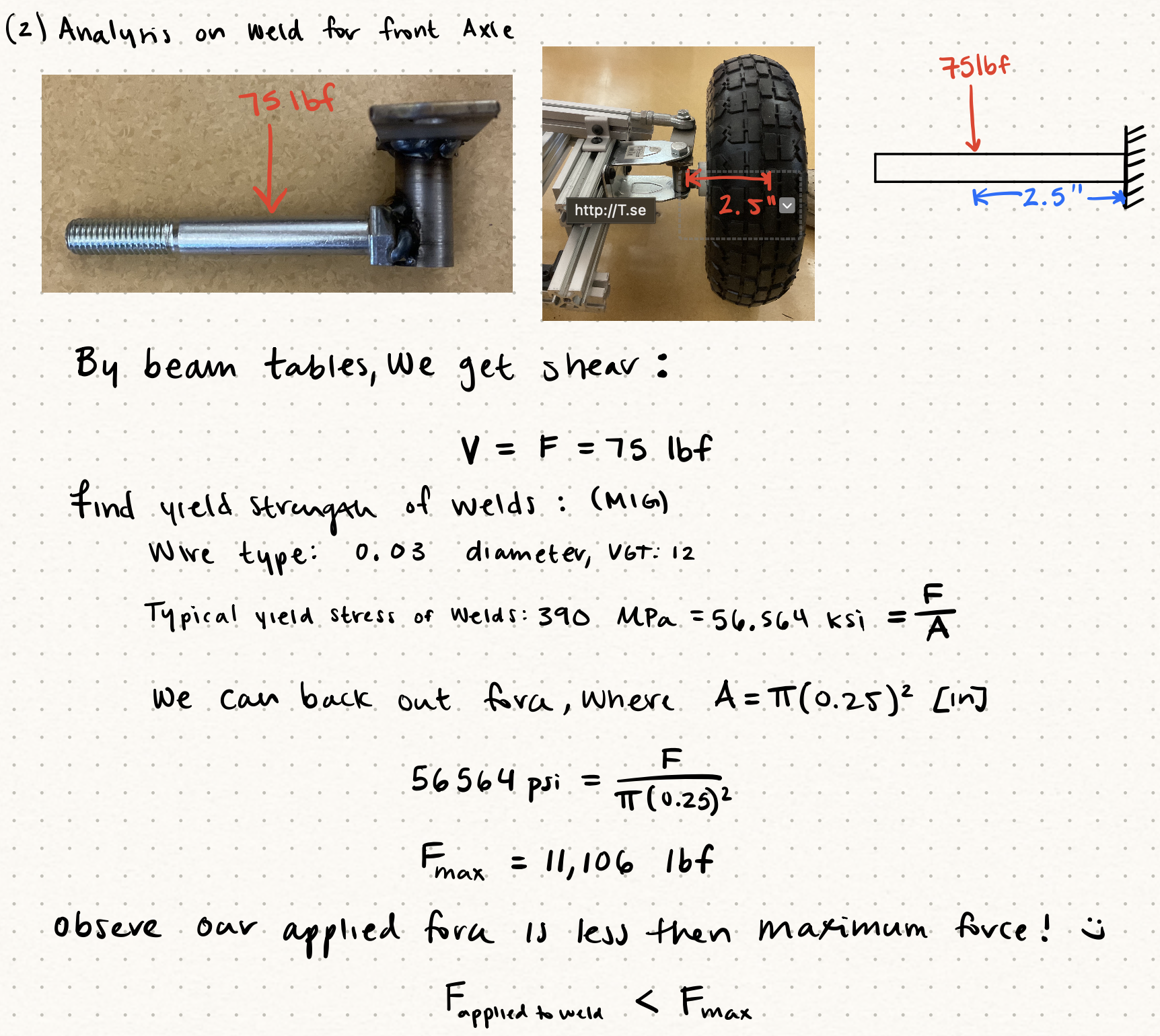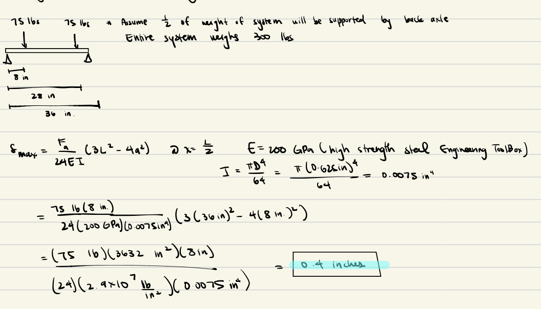 We then wanted to determine the deflection and bending stress that the back axle experiences. We could simplify the system as a simply supported beam with 2 point loads (where the bearings attach to the frame of the vehicle). Since our entire vehicle is 300 pounds, we assumed that the back of the vehicle will hold roughly half of that weight (~150 pounds). Thus, each point load will hold about 75 pounds assuming an equal distribution across the shaft.