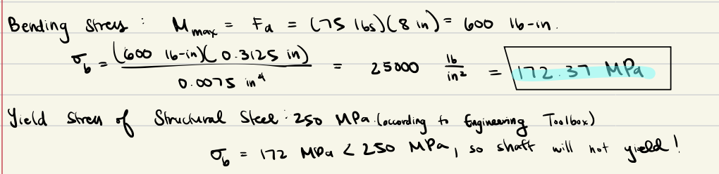 The maximum deflection calculated located in the center of the shaft is 0.4 inches, which is greater than what we expected and saw in our system as it was performing.