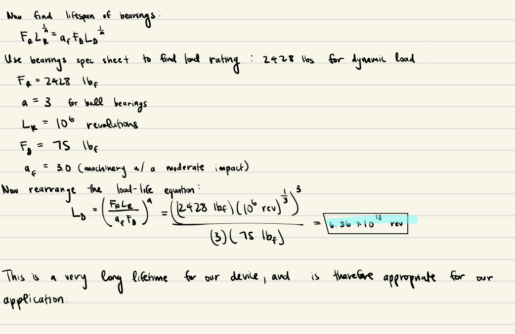 We can now find the lifetime of the bearings by using the values calculated above along with additional values found from the Block Bearing’s specification sheet.