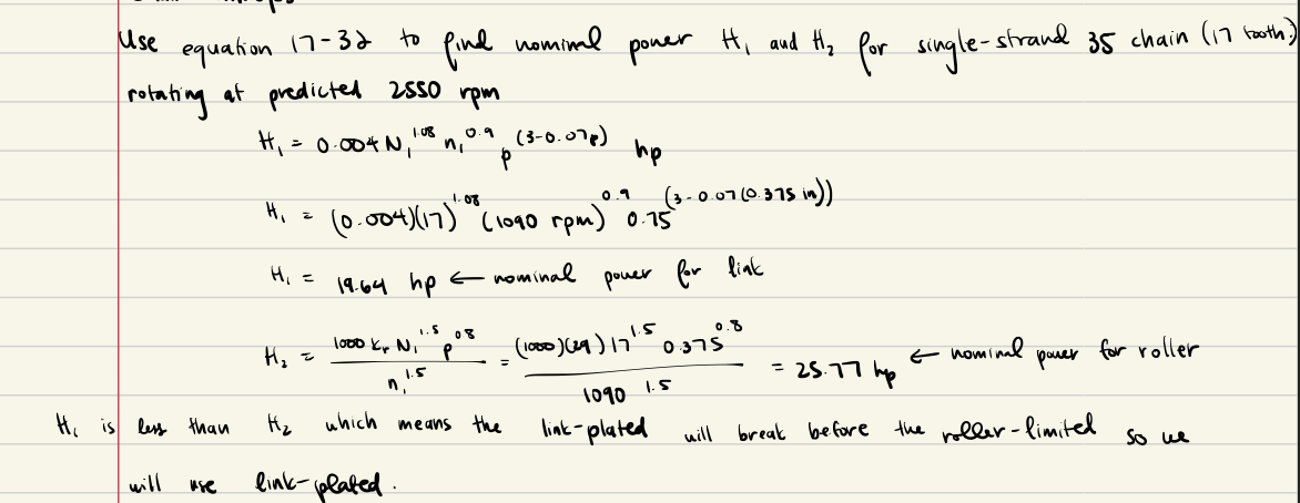 Our system uses a #35 chain to connect the sprocket, so we first had to determine the allowable horsepower of the chain and potential areas of failure. Thus, we first found the nominal power for a #35 single stranded chain.