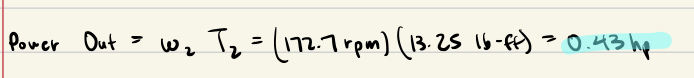 We could also determine the expected power output to be 0.43 hp by using the angular velocity and torque.